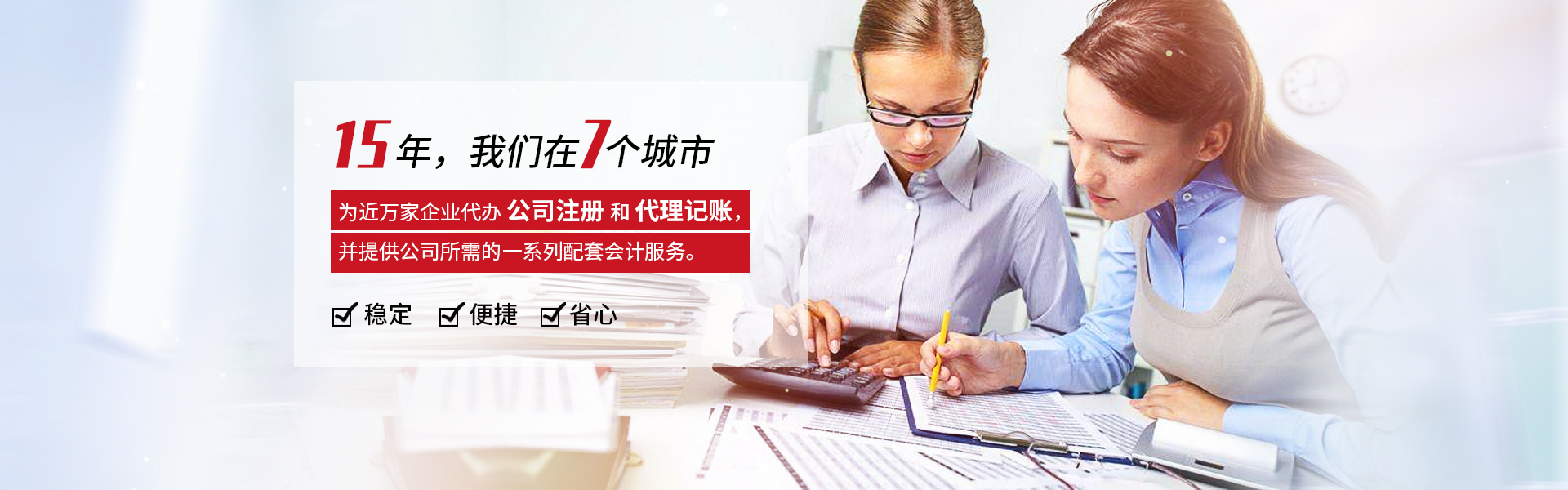 15年,7座城,為上百家企業客戶提供給類會計代理服務!